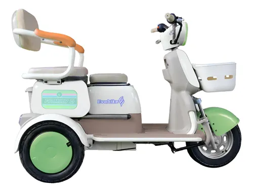La Evobike Family Q es un triciclo eléctrico diseñado para brindar comodidad, estabilidad y practicidad en recorridos urbanos. Cuenta con un motor eléctrico de aproximadamente 650W, alimentado por una batería de 48V o 60V, lo que le permite alcanzar una velocidad máxima de hasta 35 km/h, ideal para traslados seguros y eficientes en ciudad.